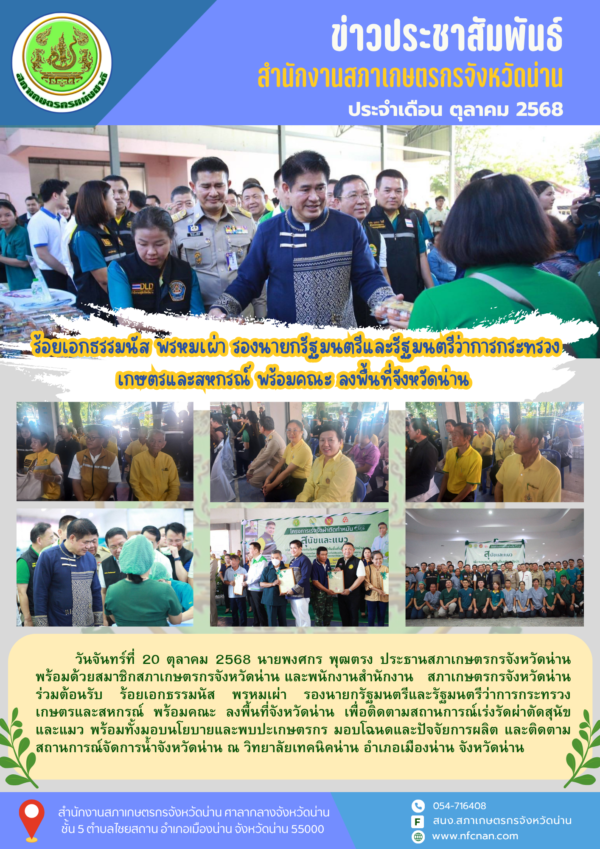 วันจันทร์ที่ 20 ตุลาคม 2568 นายพงศกร พุฒตรง ประธานสภาเกษตรกรจังหวัดน่าน พร้อมด้วยสมาชิกสภาเกษตรกรจังหวัดน่าน และพนักงานสำนักงานสภาเกษตรกรจังหวัดน่าน ร่วมต้อนรับ ร้อยเอกธรรมนัส พรหมเผ่า รองนายกรัฐมนตรีและรัฐมนตรีว่าการกระทรวงเกษตรและสหกรณ์ พร้อมคณะ ลงพื้นที่จังหวัดน่าน เพื่อติดตามสถานการณ์เร่งรัดผ่าตัดสุนัขและแมว พร้อมทั้งมอบนโยบายและพบปะเกษตรกร มอบโฉนดและปัจจัยการผลิต และติดตามสถานการณ์จัดการน้ำจังหวัดน่าน ณ วิทยาลัยเทคนิคน่าน อำเภอเมืองน่าน จังหวัดน่าน