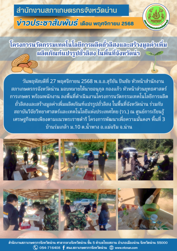 วันพฤหัสบดีที่ 27 พฤศจิกายน 2568 พ.จ.อ.สุริยัน ปันชัย หัวหน้าสำนักงานสภาเกษตรกรจังหวัดน่าน มอบหมายให้นายอนุกุล กองแก้ว หัวหน้าส่วนยุทธศาสตร์การเกษตร พร้อมพนักงาน ลงพื้นที่ดำเนินงานโครงการนวัตกรรมเทคโนโลยีการผลิตถั่วลิสงและสร้างมูลค่าเพิ่มผลิตภัณฑ์แปรรูปถั่วลิสง ในพื้นที่จังหวัดน่าน ร่วมกับสถาบันวิจัยวิทยาศาสตร์และเทคโนโลยีแห่งประเทศไทย (วว.) ณ ศูนย์การเรียนรู้เศรษฐกิจพอเพียงตามแนวพระราชดำริ โครงการพัฒนาเพื่อความมั่นคงฯ พื้นที่ 3 บ้านร่มเกล้า ม.10 ต.น้ำพาง อ.แม่จริม จ.น่าน