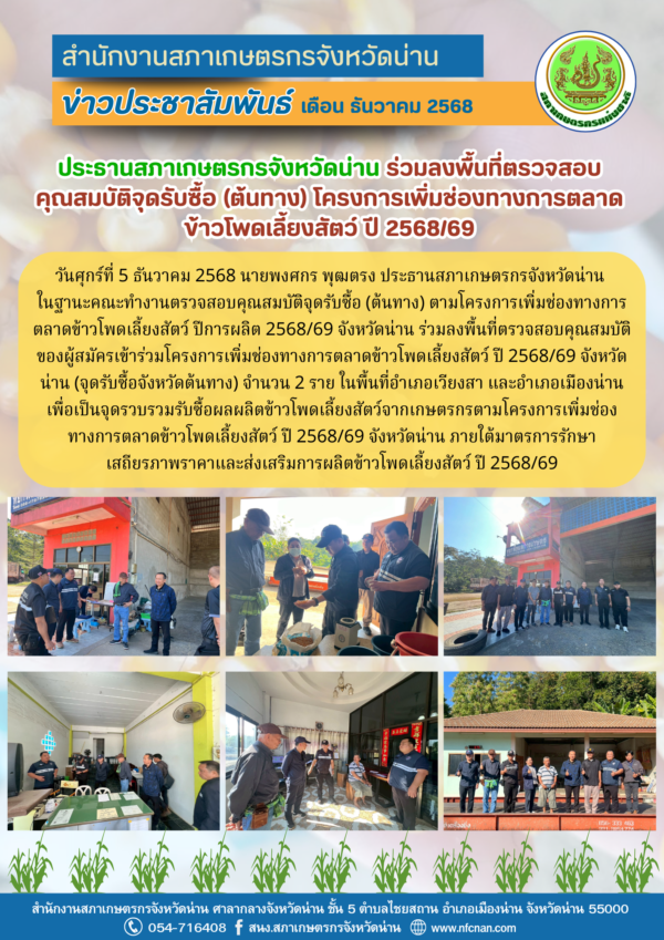 วันศุกร์ที่ 5 ธันวาคม 2568 นายพงศกร พุฒตรง ประธานสภาเกษตรกรจังหวัดน่าน ในฐานะคณะทำงานตรวจสอบคุณสมบัติจุดรับซื้อ (ต้นทาง) ตามโครงการเพิ่มช่องทางการตลาดข้าวโพดเลี้ยงสัตว์ ปีการผลิต 2568/69 จังหวัดน่าน ร่วมลงพื้นที่ตรวจสอบคุณสมบัติของผู้สมัครเข้าร่วมโครงการเพิ่มช่องทางการตลาดข้าวโพดเลี้ยงสัตว์ ปี 2568/69 จังหวัดน่าน (จุดรับซื้อจังหวัดต้นทาง) จำนวน 2 ราย ในพื้นที่อำเภอเวียงสา และอำเภอเมืองน่าน เพื่อเป็นจุดรวบรวมรับซื้อผลผลิตข้าวโพดเลี้ยงสัตว์จากเกษตรกรตามโครงการเพิ่มช่องทางการตลาดข้าวโพดเลี้ยงสัตว์ ปี 2568/69 จังหวัดน่าน ภายใต้มาตรการรักษาเสถียรภาพราคาและส่งเสริมการผลิตข้าวโพดเลี้ยงสัตว์ ปี 2568/69