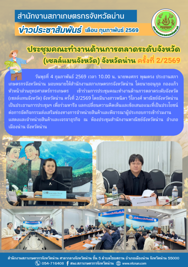วันพุธที่ 4 กุมภาพันธ์ 2569 เวลา 10.00 น. นายพงศกร พุฒตรง ประธานสภาเกษตรกรจังหวัดน่าน มอบหมายให้สำนักงานสภาเกษตรกรจังหวัดน่าน โดยนายอนุกุล กองแก้ว หัวหน้าส่วนยุทธศาสตร์การเกษตร เข้าร่วมการประชุมคณะทำงานด้านการตลาดระดับจังหวัด (เซลล์แมนจังหวัด) จังหวัดน่าน ครั้งที่ 2/2569 โดยมีนางสาวพนิดา วิไลวงศ์ พาณิชย์จังหวัดน่าน เป็นประธานการประชุมฯ เพื่อร่วมหารือ แลกเปลี่ยนความคิดเห็นและข้อเสนอแนะที่เป็นประโยชน์ต่อการจัดกิจกรรมส่งเสริมช่องทางการจำหน่ายสินค้าและพิจารณาผู้ประกอบการเข้าร่วมงานแสดงและจำหน่ายสินค้าและเจรจาธุรกิจ ณ ห้องประชุมสำนักงานพาณิชย์จังหวัดน่าน อำเภอเมืองน่าน จังหวัดน่าน