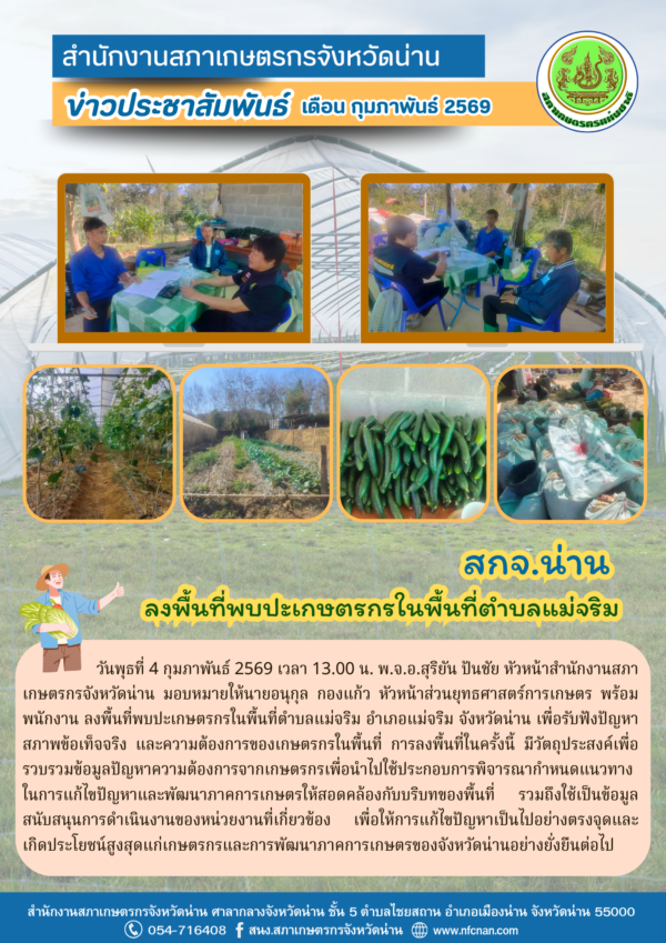 วันพุธที่ 4 กุมภาพันธ์ 2569 เวลา 13.00 น. พ.จ.อ.สุริยัน ปันชัย หัวหน้าสำนักงานสภาเกษตรกรจังหวัดน่าน มอบหมายให้นายอนุกุล กองแก้ว หัวหน้าส่วนยุทธศาสตร์การเกษตร พร้อมพนักงาน ลงพื้นที่พบปะเกษตรกรในพื้นที่ตำบลแม่จริม อำเภอแม่จริม จังหวัดน่าน เพื่อรับฟังปัญหา สภาพข้อเท็จจริง และความต้องการของเกษตรกรในพื้นที่ การลงพื้นที่ในครั้งนี้ มีวัตถุประสงค์เพื่อรวบรวมข้อมูลปัญหาความต้องการจากเกษตรกรเพื่อนำไปใช้ประกอบการพิจารณากำหนดแนวทางในการแก้ไขปัญหาและพัฒนาภาคการเกษตรให้สอดคล้องกับบริบทของพื้นที่ รวมถึงใช้เป็นข้อมูลสนับสนุนการดำเนินงานของหน่วยงานที่เกี่ยวข้อง เพื่อให้การแก้ไขปัญหาเป็นไปอย่างตรงจุดและเกิดประโยชน์สูงสุดแก่เกษตรกรและการพัฒนาภาคการเกษตรของจังหวัดน่านอย่างยั่งยืนต่อไป