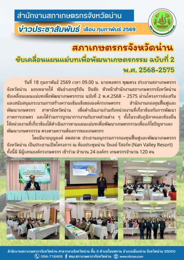วันที่ 18 กุมภาพันธ์ 2569 เวลา 09.00 น. นายพงศกร พุฒตรง ประธานสภาเกษตรกรจังหวัดน่าน มอบหมายให้ พันจ่าเอกสุริยัน ปันชัย หัวหน้าสำนักงานสภาเกษตรกรจังหวัดน่าน ขับเคลื่อนแผนแม่บทเพื่อพัฒนาเกษตรกรรม ฉบับที่ 2 พ.ศ.2568 – 2575 ผ่านโครงการส่งเสริมและสนับสนุนกระบวนการสร้างความเข้มแข็งขององค์กรเกษตรกร สำนักงานกองทุนฟื้นฟูและพัฒนาเกษตรกร สาขาจังหวัดน่าน เพื่อดำเนินงานร่วมกับหน่วยงานที่เกี่ยวข้องกับการพัฒนาภาคการเกษตร และได้ร่วมการ บูรณาการงานกับภาคส่วนต่างๆ ทั้งในระดับภูมิภาคและท้องถิ่น ให้หน่วยงานที่เกี่ยวข้องได้ดำเนินการตามแผนแม่บทเพื่อพัฒนาเกษตรกรรมเพื่อแก้ไขปัญหาและพัฒนาเกษตรกรรม ตรงตามความต้องการของเกษตรกร