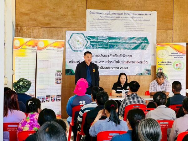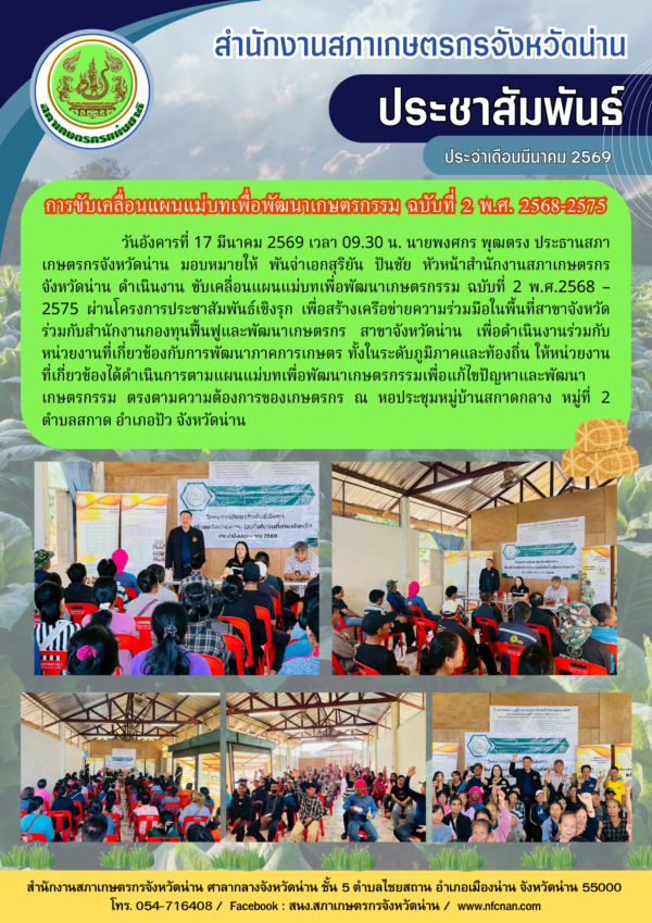 วันที่ 17 มีนาคม 2569 เวลา 09.30 น. นายพงศกร พุฒตรง ประธานสภาเกษตรกรจังหวัดน่าน มอบหมายให้ พันจ่าเอกสุริยัน ปันชัย หัวหน้าสำนักงานสภาเกษตรกรจังหวัดน่าน ดำเนินงาน ขับเคลื่อนแผนแม่บทเพื่อพัฒนาเกษตรกรรม ฉบับที่ 2 พ.ศ.2568 – 2575 ผ่านโครงการประชาสัมพันธ์เชิงรุก เพื่อสร้างเครือข่ายความร่วมมือในพื้นที่สาขาจังหวัด ร่วมกับสำนักงานกองทุนฟื้นฟูและพัฒนาเกษตรกร สาขาจังหวัดน่าน เพื่อดำเนินงานร่วมกับหน่วยงานที่เกี่ยวข้องกับการพัฒนาภาคการเกษตร ทั้งในระดับภูมิภาคและท้องถิ่น ให้หน่วยงานที่เกี่ยวข้องได้ดำเนินการตามแผนแม่บทเพื่อพัฒนาเกษตรกรรมเพื่อแก้ไขปัญหาและพัฒนาเกษตรกรรม ตรงตามความต้องการของเกษตรกร ณ หอประชุมหมู่บ้านสกาดกลาง หมู่ที่ 2 ตำบลสกาด อำเภอปัว จังหวัดน่าน