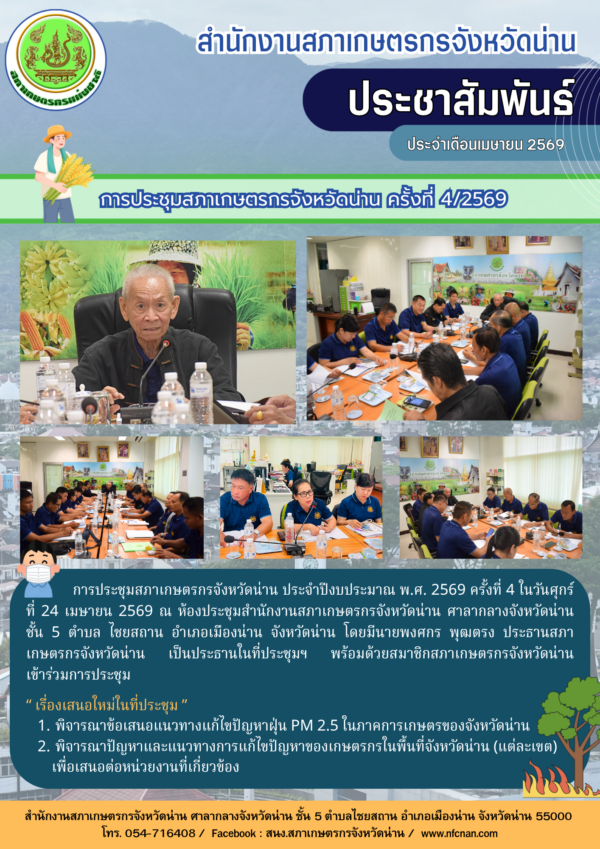 การประชุมสภาเกษตรกรจังหวัดน่าน ประจำปีงบประมาณ พ.ศ. 2569 ครั้งที่ 4 ในวันศุกร์ ที่ 24 เมษายน 2569 ณ ห้องประชุมสำนักงานสภาเกษตรกรจังหวัดน่าน ศาลากลางจังหวัดน่าน ชั้น 5 ตำบล ไชยสถาน อำเภอเมืองน่าน จังหวัดน่าน โดยมีนายพงศกร พุฒตรง ประธานสภาเกษตรกรจังหวัดน่าน เป็นประธานในที่ประชุมฯ พร้อมด้วยสมาชิกสภาเกษตรกรจังหวัดน่าน เข้าร่วมการประชุม
